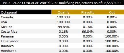 目前美国、墨西哥和哥斯达黎加三队争两个直通世界杯名额,美国由于巨大的净胜球优势(13)基本锁定一个名额,墨西哥由于领先哥斯达黎加3分,末轮拿分即可锁定另一个出线名额。